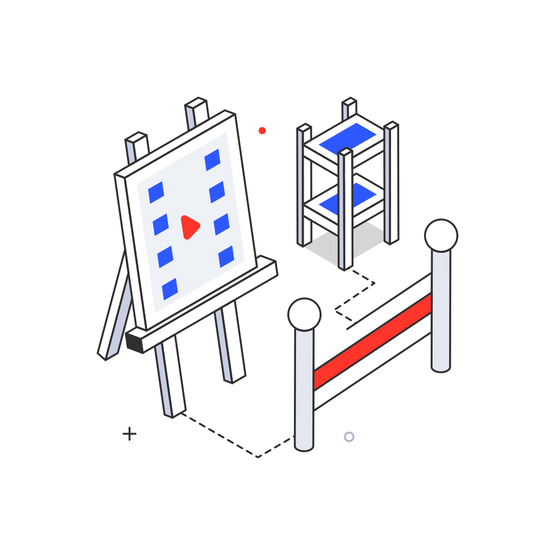 Isometric digital illustration of an art display setup with a framed painting featuring blue squares and a red play button, blue shelves, a barrier with red and white stripes, and a small white sphere on a stand.